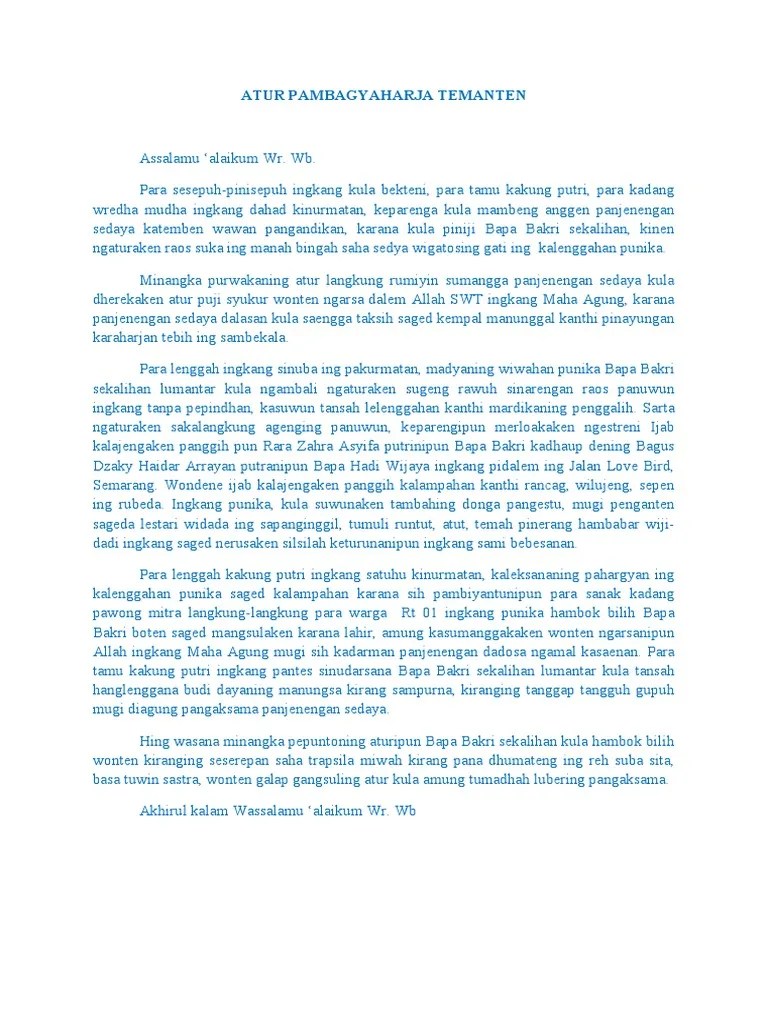 Pidato penampi pasrah pengantin memakai bahasa jawa. Atur pasrah temanten bade panggih · bismillaahirrahmaanirrahiim. Pasrah panjenengan calon temanten kakung ingkang nama radit setya aji putranipun bapak darma ingkang badhe sesarengan gesang bebrayan kaliyan . Cekap semanten atur pasrah kula, kirang treping subasita anggen kula matur nyuwun pangapunten. Dalam acara pasrah lan panampi pengantin pihak keluarga penganten pria menyerahkan pengantin untuk dapat dilaksanakan acara "panggih " . Sesorah tersebut merupakan pidato yang . Dalam rangkaian upacara perkawinan tersebut terdapat sesorah pasrah temanten dan sesorah tampi pasrah temanten. Pidato bahasa jawa pasrah penganten pidato serah terima pengantin dalam bahasa jawa atur pasrah temanten singkat teks pidato pasrah temanten . Salah satu rangkaian adat jawa setelah melangsungkan resepsi pernikahan adalah, keluarga temanten perempuan memboyong kedua mempelai kepada . Berikut informasi sepenuhnya tentang atur pasrah temanten kakung bahasa jawa. Download lagu pidato jawa pasrah manten kakung mp3 dan mp4 di gudanglagu321. Kumpulan lagu pidato jawa pasrah manten kakung full album.